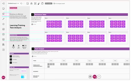 Mural allows participants to both learn and test key practices in one space using hundreds of templates for collaboration: study guide template, meta storyboarding template; E-learning storyboard template; curriculum development template; etc. Mural is an efficient non-LMS source for learning analytics [27]. Mural is applicable to different learning activities, such as project work, brainstorming activities, mind mapping, education event organizing, and team building class activities.