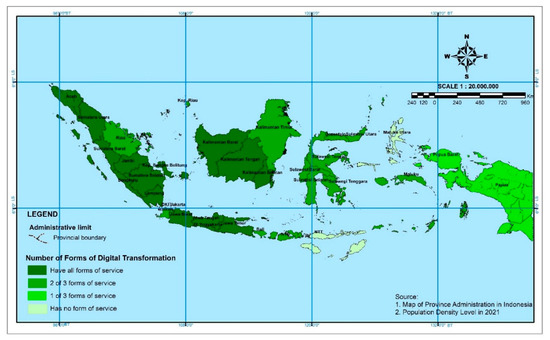 According to [27], digital health service applications in each province in Indonesia are grouped into three: health services (63 services), health information systems (82 systems), and helpdesk or customer management systems (51 types). The availability of digital forms of transformation of health services is visualized in a typology map of the implementation of digital health services in Indonesia which is classified based on four categories, namely provinces that have all forms (health services, information systems, and help desks), provinces that have two forms, and provinces that have one form, as well as provinces where no form of service was found. The typology map (Figure 1) of the implementation of digital health services in Indonesia shows that digital health services dominate in areas in the Western and Central parts of Indonesia, which varies widely from the Central and Eastern parts of Indonesia, which tend to have limited forms of digital transformation.