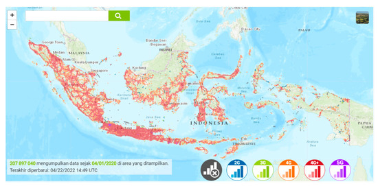 - Nperf. Telkomsel Peta Cakupan 3G/4G/5G, Indonesia. Available online: https://www.nperf.com/id/map/ID/-/5119.Telkomsel/signal/?ll=-2.5678942164342513&lg=118.01999999999998&zoom=5 (accessed on 22 April 2022).