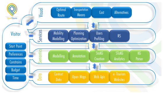 OptiTours aims to provide capabilities for deciding and recommending a pedestrian- over a vehicle-based tour, a group over a self-organized guided tour, an open space or an in-house tour, a one-day or an hour tour, etc. Initially designed and recommended tours of OptiTours knowledge base will be updated constantly with new information as well as with new tours. To deliver the aforementioned concept, a high-level technical architecture of the OptiTours main framework is proposed (see Figure 1). It consists of five distinct layers: (a) visitor; (b) data; (c) semantic; (d) service; and (e) visualization.