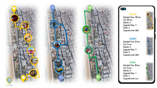 OptiTours experimental implementation will be tested and evaluated in a metropolitan city. Various routes, context, and visitor data will be tested through various use-case scenarios. Each scenario will be evaluated based on the extracted outcome. The optimal tour/route is the tour/route that is smart, green, and comfortable. Nonetheless, there might be routes that are smart but not green (e.g., visiting many places using a cab or bus), routes that are green but not smart (e.g., visiting only a nearby place on foot), and routes that are smart and green but not comfortable (e.g., visit many outdoor places of interest on foot during a rainy or cold day). Furthermore, some routes might be more expensive or longer. OptiTours will combine all available data and information, providing not only the optimal route but also alternatives with various labels, i.e., smart, green, and comfortable (see Figure 2).