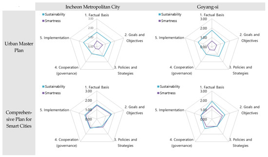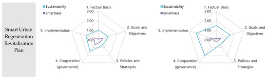 | Cooperation(governance) | A | The most inadequate sector alongside the strategies in both basic urban and smart urban plans (1 point range: partially mentioned but not specific or appropriate). The urban revitalization plan receives relatively high scores in establishing a cooperative system given the nature of urban revitalization projects based on residents’ participation. All three plans score close to zero in smartness, indicating that they are rarely considered in the plan. This is due to the lack of smart technologies or planning techniques to promote cooperation systems as well as lack of practical considerations despite the importance of cooperation and governance in planning, so additional related smart technologies and planning techniques are required. |