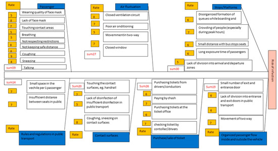 For the identification and validation of the dominance of hazard factors, an expert survey was conducted online for transport service users to collect data and determine the risk of COVID-19 infection. For the assessment, a fishbone diagram was used for the risk of infection to identify the categories of its causes, which were then explored for possible causes that pose a risk of infection. In general, 321 transport users and two groups of transport experts responded to the research. The fishbone diagram considers the risk of infection by identifying the categories of its causes, which are then explored for possible causes that pose a risk of infection. The next step is to determine the assessment of these risks. The adopted scale of 1–10 determines the risk of infection. The diagram collected from the group of experts, which focused on the identification of epidemic hazards in transport and estimating the exposure and result of the COVID risk, is depicted in Figure 2.