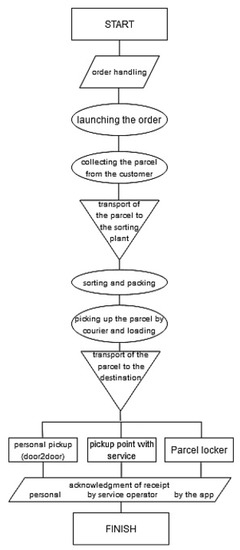 The process algorithm of courier parcel services in terms of the occurrence of contact (human or surface) operations is depicted in Figure 3.