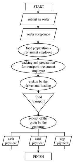 The second transport service was catering delivery. This service is related to food transportation. The process algorithm of catering delivery in terms of the occurrence of contact operations (human or surface) has been depicted in Figure 4.