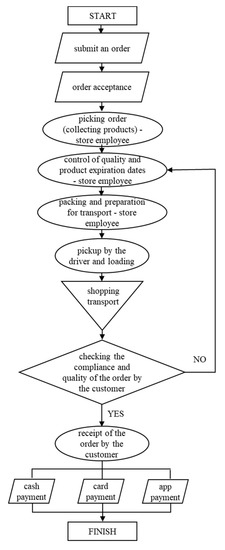 The next transport service was shopping delivery. This service is related to grocery transportation, as offered by stores or malls, because other products are mostly delivered by courier service. The process algorithm of shopping delivery in terms of the occurrence of contact (human or surface) operations has been depicted in Figure 5.