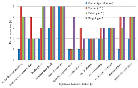 The analysis shows that for catering delivery, the total hazard assessment is 37. The analysis of the catering service also includes the preparation and packaging of dishes; in this respect, in the factor called “loading time”, the hazard rating is the highest 5. However, due to the short delivery time and usually direct delivery to the customer, during the delivery process, the driver does not come into contact with too many additional recipients. In the case of catering services, the shortest possible delivery time is expected. Therefore, there is no disinfection or isolation of the product. It results in an overall assessment is high (5). The hazard related to the time between consecutive uses of a means of transport after contact with a potential source of infection was also assessed as 5. This comes from the fact that the car has many plastic elements on which the virus can survive the longest (up to 72 h) creating a threat. After a whole day of work, the vehicle is handed over to another employee or handed back over to the employee who used the vehicle on a given day. It is not disinfected or isolated after each use. The hazard related to the type of possibility of infection depending on the delivery point is also high and is assessed at 4. The contact delivery takes place at the recipient’s address. The deliveryman has direct contact with the recipient, but the pickup is carried out by one person.