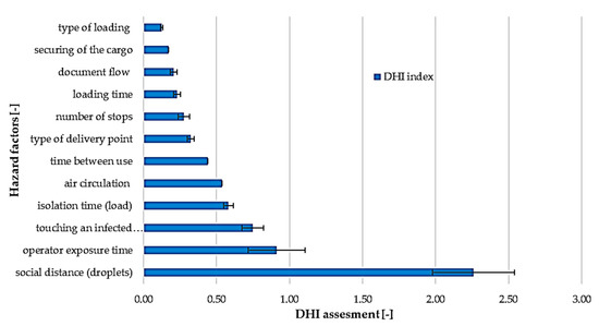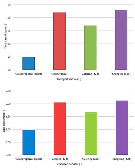The comparison of total hazard assessment and DHI indices for the analyzed transport services is presented in Figure 7. The highest value of epidemic hazard was estimated for shopping delivery, followed by courier d2d delivery in third place and catering delivery, while courier parcel locker turned out to be the safest.