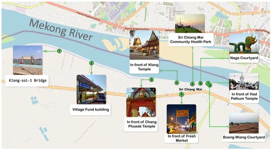 Sri Chiang Mai is a tourist town in Nong Khai Province, Thailand, with a long length of land bordering the Mekong River. It is opposite Vientiane, the capital city of Laos, which has one of the most beautiful landscapes. Along the banks of the Mekong River, shops, restaurants, and beverage stands will serve tourists and locals who come to engage in activities such as work, exercise, and leisure. Thus, a large number of locals and tourists visit this area every day. It is also for these reasons that the Sri Chiang Mai council provides Wi-Fi infrastructure, which is operated by National Telecom Public Company Limited. The primary objective of this network is to provide broadband internet access to all visitors in the city. There are nine Wi-Fi APs located along the Mekong River, which are highlighted in Figure 1 with green markers. The node names and locations are provided in Table 2.