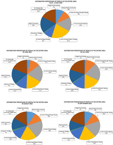In Figure 14, the distribution percentage of people per area during the period 22 May 2022–September 2022 shows an interesting trend where the Naga courtyard, Sri Chiang Mai Community Health Park, and the area in front of the Had Pathum Temple are clustered together. These data can be explained by taking into consideration the following factors: