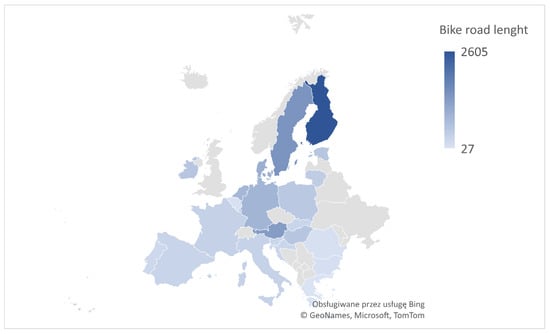 A city without an extensive system of bike roads cannot be smart because it cannot use new concepts of bike sharing and other smart solutions. A bike-sharing system is a service in which bikes are available for individual users to share on a very short-term basis. In the newfangled bike-sharing solution, there is a special smartphone application to monitor the system. Those bike-sharing systems can be also very beneficial for cities []. The extensive bike road system is the first step to building bike-sharing facilities. After there are enough bike lanes in particular area, the local authorities can start to build a system of bike sharing [].