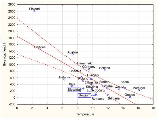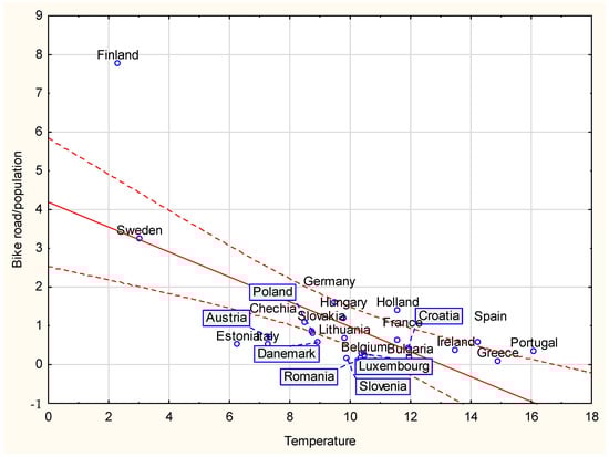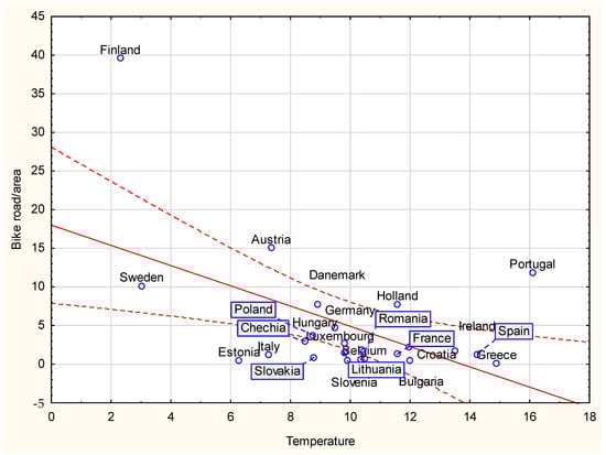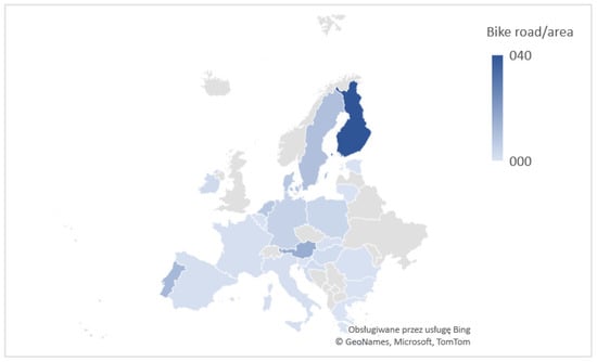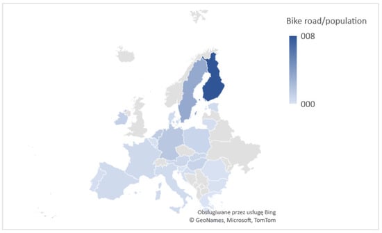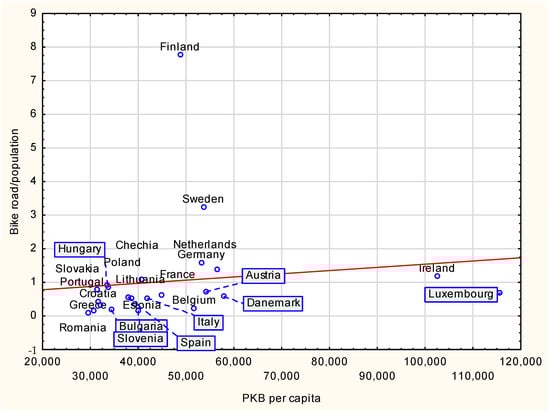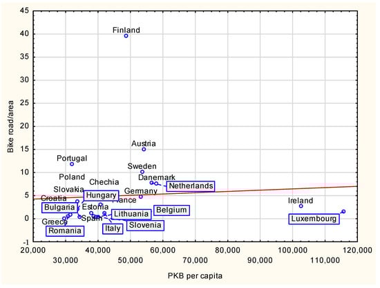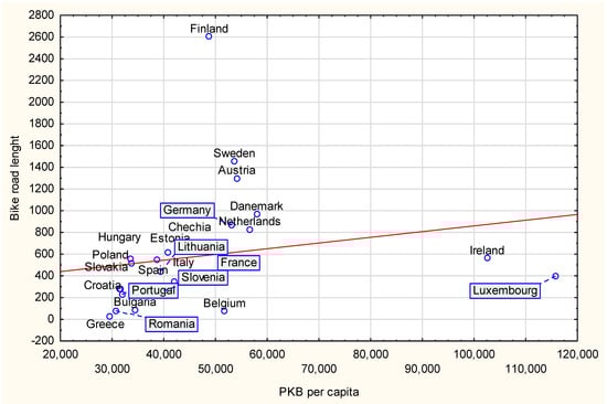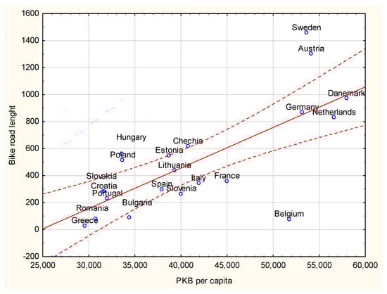 In the analysis, there is a hypothesis about the relations between the bike road system and GPD per capita. The GPD per capita indicator was used because it can be seen as a good measure of the economic development of the country [,]. The value of the GPD per capita indicator was used according to World Economic Outlook Database [].