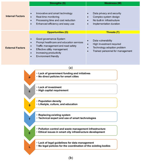 (a): SWOT analysis for existing smart cities. (b): PESTEL analysis for Dhaka, Bangladesh.