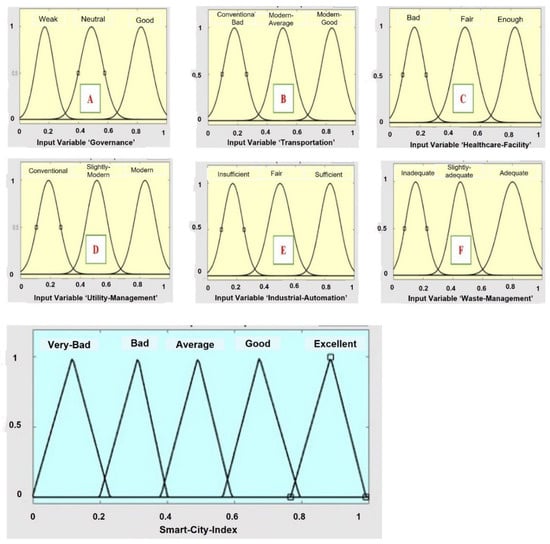 Input variable “Governance” has categorized as three membership functions named “Weak”, “Neutral”, and “Good”, whereas “Transportation” has three membership functions named “Conventional_Bad”, “Modern_Average”, and “Modern_Good”. “Utility_management” has three categories of membership functions named “conventional”, “slightly_modern”, and “modern”, while “Waste_Management” has three membership functions named “Inadequate”, “Slightly_Adequate”, and “Adequate”. “Healthcare_Facility” refers to three membership functions named “Bad”, “Fair”, and “Enough”.