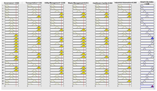 Based on the identified barriers in the SWOT and PESTEL analyses, essential parameters such as governance, transportation, healthcare facilities, utility management systems, waste management systems, and industrial automation were selected for the smart city transformation. A fuzzy rule-based smart city prediction framework was shown in Figure 4, where these parameters were considered input variables and the smart city was the output variable. The input variables are “governance”, “transportation”, “utility management”, “waste management”, “healthcare facility”, and “industrial automation.” The centroid-based defuzzification method was used in the fuzzy inference system. The input and output variables for the fuzzy inference system are presented in Figure 5.