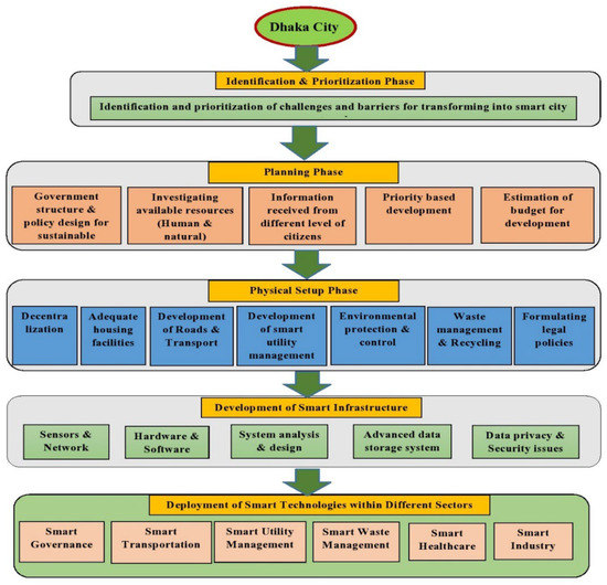 Smart city assessment techniques have been developed in research, considering various parameters, including governance, modern technologies, citizens, economy, livability, and environment [17]. Another study has described the main parameters for smart cities as environment, socio-economic factors, technology, legal aspects, and governance [18]. However, various other segments, such as transportation, waste management, utility management, healthcare management, and industrial automation, must also be considered in developing smart cities. Research has been conducted on transforming different cities around the world into smart cities. To the best of the author’s knowledge, no study has been conducted on smart city implementation using modern technologies in Dhaka, integrating governance, transportation, healthcare management, utility management systems, waste management technology, and industrial automation technologies. Therefore, this paper’s main attempt is to design a transformational model for Dhaka’s paradigm and discuss the execution procedure for the transformational model.