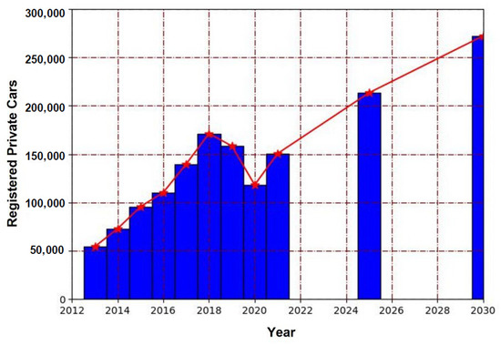 The primary modes of transportation in Dhaka are motorcycles, rickshaws, public buses, Lagunas, private cars, CNG, minibusses, and taxis. The number of personal vehicles is increasing daily, which is predicted using linear extrapolation that in 2025 and 2030, there will be around 213,268 and 272,107 cars, respectively. This extrapolation shows that the demand for private vehicles increased, which is a primary challenge for the city authorities, although during 2020–2021, it slightly decreased due to the COVID-19 situation.
