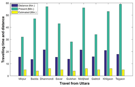 A news report discloses that the average traffic speed in Dhaka is 6.4 km per hour (kph), which will be 4.7 kph by 2035 with current vehicle growth. It also claims that the strategic transport plan could improve the average traffic speed by about 13.7 kph [66]. The times required to travel from Uttara, Dhaka, to different places in the city between 7 am and 10 am are indicated by green bars. The yellow bars represent the estimated time required to complete the journey at the smart city transportation speed of 13.7 kph. Figure 10 compares travel times for the distance between Uttara and different places in Dhaka.