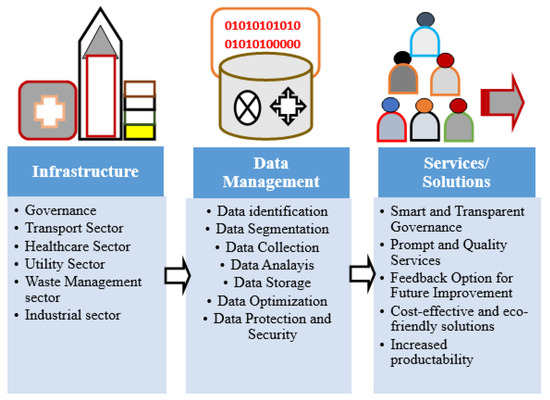 This section provides an overview of the current literature on transforming cities into smart cities using innovative technologies. Ibrahim et al. [32] proposed a theoretical logic model for transforming cities into sustainable smart cities. Meanwhile, Kumar et al. [33] presented a framework consisting of planning, physical setup, ICT infrastructure setup, and deploying smart solutions. Kuru et al. [34] designed a transformation framework called TCitySmartF with four dimensions: engagement with stakeholders, development of smart city infrastructure, integration into smart city domains, and integration with national and international environments. The framework aims to incorporate distributed services and assets, deliver effective, user-friendly solutions and real-time aid services, enhance sustainability, and promote economic expansion and competitiveness.