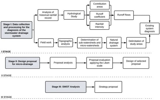 Considering the morphology of the terrain and the meteorological conditions that condition the hydrographic system of the study area, it is important to develop stormwater-management projects that evaluate the behavior of the existing sewage infrastructure on campus and in populated peripheral zones. Furthermore, the hydrological analysis of watersheds and micro-watersheds is a fundamental tool in stormwater management in occupied areas with future expansion plans. In this case, to mitigate flooding problems within a university campus, work phases have been contemplated that include: (i) data collection and processing for the stormwater drainage system diagnosis; (ii) a design proposal for micro-drainage; and (iii) a SWOT analysis to propose improvement strategies in water management (Figure 2).