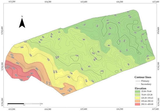 The campus has an irregular morphology that includes elevations between 25 and 450 m above sea level (Figure 3) and maximum slopes of 45°. This condition allows the formation of a series of natural drainages that preserve the protective forest and flow through a storm drainage system that avoids flooding problems on campus. The main buildings, where most of the university’s activities occur, are mainly in the light-green zone.