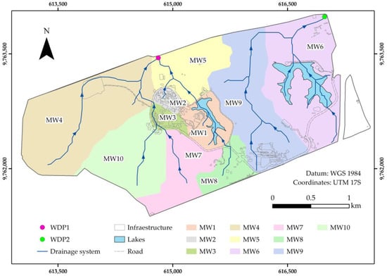 In the specific analysis, ten drainage micro-watersheds were determined (Figure 5), with micro-watershed four occupying the largest area, with maximum slopes; on the other hand, micro-watershed two is the smallest area and has the lowest slopes (Table 4). The drainage system obtained from the elevation and slope data reflects main and secondary channels that converge at two main water dump points (WDP) or outflow points to the north of the study area (Figure 5). WDP1 collects the flow generated by sub-watershed one, while WDP2 collects the discharge from sub-watershed two.