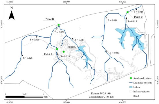 The study considered four analysis points: (i) point A, where a large part of the flows generated by the different areas where many of the campus activities take place to converge; (ii) points B and C, which are the outlets for the entire ESPOL storm drainage system; and (iii) point D, characterized by being the busiest zone on campus, locating a cafeteria and other classroom buildings are located; the latter has local flooding problems. Figure 7 shows the location and slope value corresponding to the sections of each point.