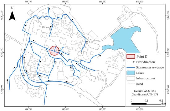 In point D, there are infrastructures where concrete covers a large part of the soil. Unlike the natural ground, concrete does not allow water loss by infiltration, favoring the flow transit [74], making the area vulnerable to flooding due to the abovementioned conditions [75,76].