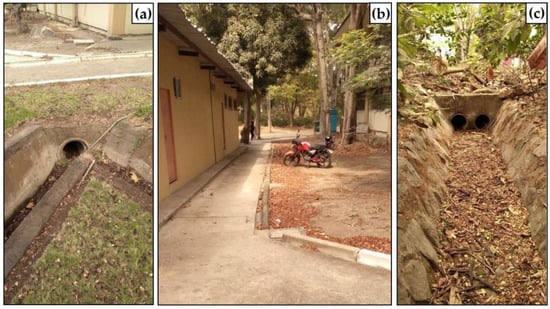 The water flow coming from WDP1 goes through an unlined channel that conveys the water to the outside of the campus (Figure 6a), to the sector called “Socio-Vivienda” (Figure 6b), passing through two pipes of Ø500 and Ø800 mm (Figure 6c). The flow of WDP2 discharges to the drainage system of a perimeter road (first-order highway).