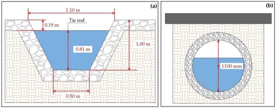 The study determined the capacity of the existing channel and pipe, using the depth of the water flow through the formula developed by Robert Manning [63], in which the estimated flow depends on parameters such as roughness coefficient (n), the hydraulic radius (Rh), longitudinal slope (S), and cross-sectional area (A) of the existing systems analyzed (Equation (5)). The value of n was taken from [63] and as the specialized literature on this subject indicates, this value depends on the type of material in which the channel or pipe is constructed (e.g., closed conduit, lined channel, natural flow, excavated) and the lining material.