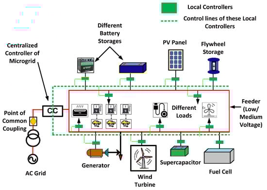 If the microgrid is a DC one and uses a central generator, it has to be controlled from one location. Connected users are the building blocks of this network. The data and profiles of all users are stored in a single, easily accessible database. This data could be associated with a user’s account or with some other piece of user-generated content or data. It is easy to make and explain a unified structure. It is most useful to think of it as a DC microgrid due to the way its power sources and loads are connected (through a centralized controller and an automated communication network). A hierarchical control structure is ideal for a large DC microgrid due to the additional layers of protection it provides. This organizational setup delineates the various levels of management. When compared to centralized control, the reliability of hierarchical-type control is higher because it continues to operate even if the central controller fails. Control mechanisms are necessary for a DC microgrid because of problems with voltage regulation on the DC bus, poor power quality, and uneven load distribution. To address these issues and guarantee some degree of control is maintained in the event of a centralized system failure, it is generally accepted that hierarchical control systems are necessary. Nothing has changed, and it still performs as expected [98,99,100]. The basic architecture of DC microgrid having centralized control has been shown in Figure 8.