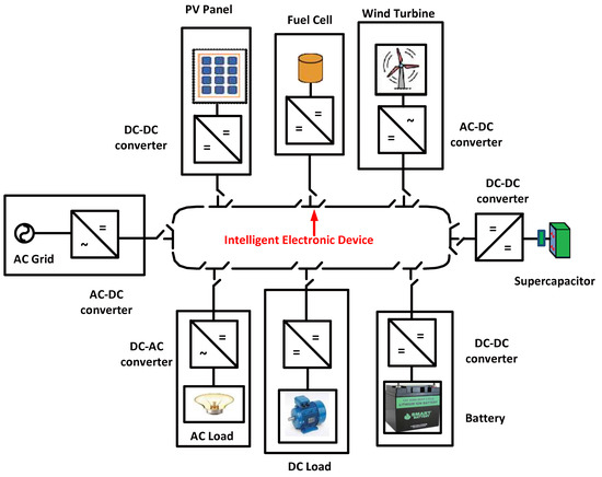 DC microgrids have become increasingly important in recent years due to the increasing sophistication with which they can integrate various energy storage systems like batteries and supercapacitors, as well as the increasing use of solar photovoltaic (PV) and fuel cell power, among other DC loads [1,2,3,4]. The flexibility of DC microgrids to support a variety of DC loads is another factor contributing to their growing popularity [5,6,7,8]. Harmonics, frequency control, synchronization, reactive power control, and other controls are not necessary with DC microgrids [9,10,11]. When multiple distributed generators, such as photovoltaic, wind, or fuel cell generators, are combined with loads and energy storage systems on a single DC bus, voltage regulation and power distribution become more challenging [12,13]. Figure 1 shows the basic architecture of a DC microgrid.