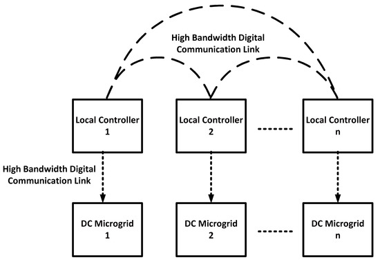 As a result of the distributed architecture, data might have several owners. To optimize system performance, users are frequently granted access to additional hardware and software components. The reliability of a distributed system is enhanced because it is protected from the failure of individual components. Through the network connection, all of the dispersed units may talk to one another. Despite its numerous benefits, dispersed control may provide even greater functionality than centralized control. Communication delays and sensor measurement mistakes indicate a failure to properly analyze results and implement suitable settings. The primary drawbacks of distributed control systems are bus voltage volatility, inaccurate power monitoring, and difficult analytical performances [97,98,99]. The basic architecture of DC microgrid having distributed control has been shown in Figure 7.