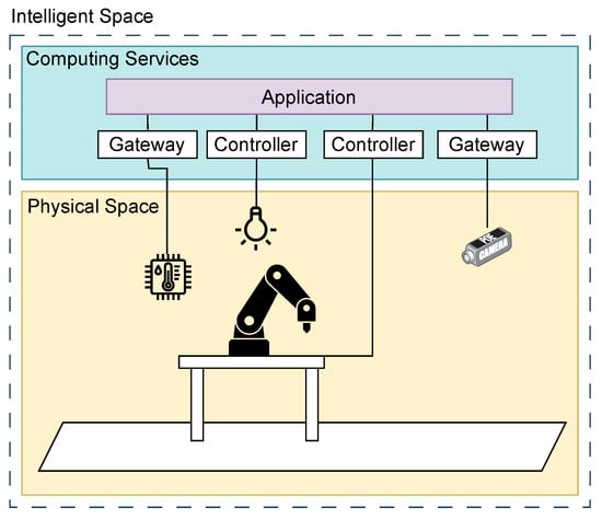 Moreover, a highly compatible concept for enabling the I5.0 implementation is the intelligent space (IS). An IS, represented in Figure 2, can be defined as a physical space equipped with a network of sensors which obtains information about the place it observes, a network of actuators which allows its interaction with users, and changes in the environment through computing services. Such sensors, actuators, and computing services must be governed by an infrastructure capable of collecting and analyzing the information obtained by the sensors and making decisions [21,22,23]. One of the key concepts within ISs is that the environment can sense, interpret, recognize user behavior, adapt to preferences, and provide natural interactions between humans and intelligent systems, using the IoT, AI, computer vision, and data analytics to create dynamic and adaptive environments in real time.