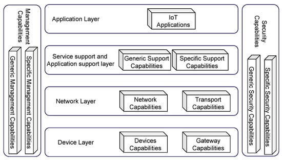 The communication architecture of a cognitive factory, although adaptable, is not a generic architecture. It has to comply with objectives to meet the specific requirements of its applications and rationalize the use of its infrastructure resources. To fulfill these main objectives, the architecture should possess characteristics such as interoperability, availability, reliability, and scalability. The International Telecommunication Union (ITU), defined by its Telecommunications Standardization Sector (ITU-T), approved the IoT reference model [44] for IoT applications that is shown in Figure 3.