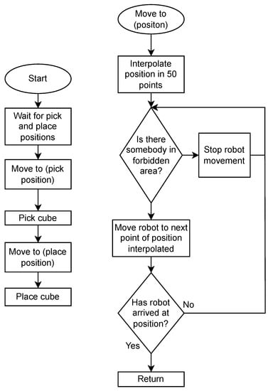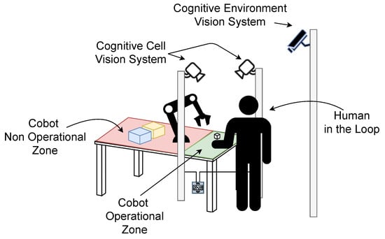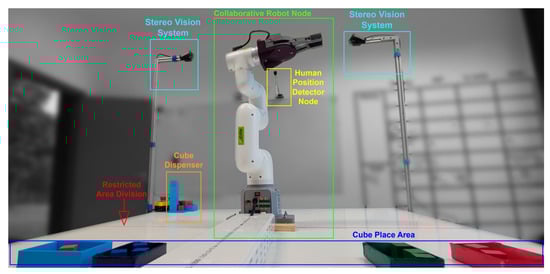 Regarding the system’s capabilities, the main focus of its development was to ensure the safety and collaboration between human and robotic arms in real-time and dynamic tasks as an example to demonstrate the wide range of application that can be developed. As can be seen in Figure 4, the whole ecosystem is composed of:
