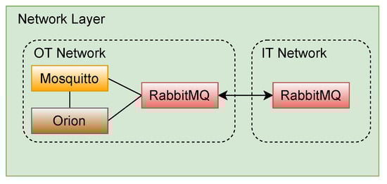 For the integration of the networks, the OT network was integrated with the IT network through the utilization of two RabbitMQ brokers, using a clustering configuration with each instance in a different type of network. These brokers played a pivotal role as central brokers, facilitating the exchange of data between both domains. Furthermore, it is worth mentioning that RabbitMQ on the OT domain was connected to both Mosquitto and Orion brokers to enhance the interconnectivity and interoperability between devices. This interconnected architecture involving these three brokers effectively bridged the gap between networks, allowing efficient and secure communication.