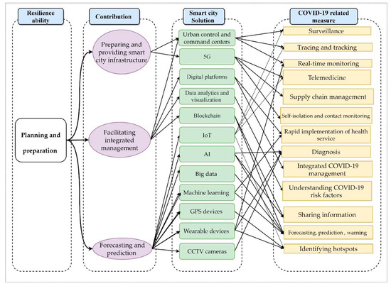Generally, approaches and methods that focus on enhancing resilience have emphasized the characteristics and features that enable a system to recover from and adapt to changes and shocks. Thus, resilience can be defined as the capacity of a system to perform four functions in the face of adversity: planning and preparation; absorption; recovery; and adaptation [33,70]. Many urban processes can be made smart, like infrastructure systems, security surveillance, mobility and transport systems, city buildings, energy grids, education, health, and public services. Table 1 and Figure 1 below illustrate the different smart solutions and technologies in urban planning and resilience strategy. Sharifi et al. [33] stressed that urban digital transformation could develop the capacity to predict epidemic patterns, facilitate an integrated and timely response, minimize supply chain disruptions, and provide a solution for optimizing the normal operation of cities in the state of the epidemic. Urban resilience is the key element in helping cities recover rapidly when an emergency occurs [71]. Amirzadeh et al. [72] proposed a framework of three principles for mapping the requirements of making cities pandemic resilient. The principles include health requirements, environmental and psychological principles, and general resilience principles. Similarly, Fan et al. [73] highlighted the importance of urban form, infrastructure, and urban governance in building resilience. They projected a future of planning practices that integrates decisions at all levels and addresses inequalities and vulnerabilities with an emphasis on social infrastructure [73]. To promote social resilience, planners should consider long-term adaptation measures and the well-being of the population [74]. The planning process should be open, participatory, and inclusive of the disadvantaged city dwellers to build resilient future cities [75].