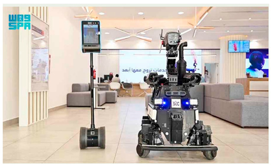 Saudi Arabia has developed several recent digital tools in AI to contain and minimize the spread of the COVID-19 virus and enhance urban resilience (Table 3). This study categorized the deployed smart tools into shared and personalized access. Both covered areas include health, crowd management, sanitation, guidance, religious learning, navigation, tracking, security, transportation, and environmental monitoring. The shared access smart infrastructures include smart robots, Holodoctor services, and thermal cameras, whereas the smart initiatives with personalized access, such as smart bracelets, smart cards, and those used as smartphone applications, are primarily individualized, as shown in Table 2. The intelligent smart robots were deployed to serve many purposes, such as sanitizing the holy sites, guiding, advising, and answering religious questions, dispensing Zamzam water, distributing the holy Quran, delivering sermons, and calling for prayers, and enforcing the social distancing instruction to prevent the spread of the COVID-19 virus. In addition, the smart robots were equipped with barcodes to enable the pilgrims to download services on their smart cell phones (Figure 3). Also, pilgrims can press the instructions button on the smart robots to access prayer-related information such as prayer times, muezzins, imams, and weekly calendars. For instance, the security robots were designed to facilitate strict following of the Ministry of Health’s precautionary measures. Furthermore, through AI techniques, the robots could measure body temperature, monitor the adherence to wearing the face mask, and provide round-the-clock purification and sterilization of the holy places. Moreover, guidance robots were deployed to help pilgrims and worshipers during the Umrah rituals. The robots can advise and answer 100 to 150 questions daily [103]. The most common users interacting with the guidance robots are pilgrims from Saudi Arabia, Syria, India, and Pakistan [103]. Also, fleets of guidance robots were deployed to assist female worshippers in answering their questions in 11 languages, allowing them to connect with Islamic scholars [104].