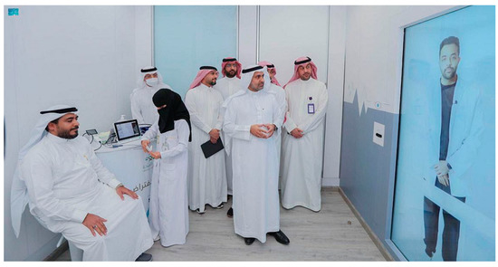 Similarly, smart thermal and imaging cameras were deployed at all the major entrances of the holy site to scan and detect likely infected individuals. Each camera can scan 25 people simultaneously [106] These cameras have an advantage over conventional cameras due to their scanning, counting, tracking, and detecting features [92]. Moreover, there are eHealth smart initiatives where several innovative smart solutions were deployed in the holy city of Makkah to serve and safeguard pilgrims. For example, the Holodoctor initiative for medical consultation was developed to offer modern medical services to pilgrims through video conferences with Seha Virtual Hospital, Riyadh (Figure 4). The Holodoctor smart initiative provides several healthcare services to pilgrims and worshipers, such as investigation, diagnosis, and disbursement of medications through direct contact with the Seha Virtual Hospital [107]. Other eHealth initiatives include personalized access applications such as Tawakkalna, Sehhaty, and Tabaud, among others (Table 2). Among the smart solutions used in containing and preventing the spread of the pandemic is the radio frequency detection chips developed in the form of a bracelet. It is an IoT device capable of providing an array of information related to the pilgrim, such as health status, including measuring blood oxygen and pulse, emergency and security assistance requests, and receipt of messages [89,93]. In the 2021 pilgrimage, 5000 smart bracelets were distributed to pilgrims to facilitate the strategized precautionary measures to prevent the pandemic’s spread among pilgrims [26]. Similarly, internet-free smart cards were developed and distributed to pilgrims. The smart cards served as electronic wallets to the pilgrims, enabling electronic purchases, navigation, and tracking services.