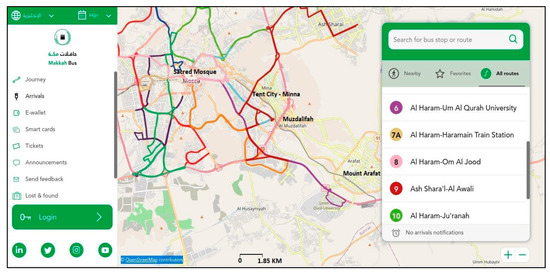 Moreover, the Saudi green initiative and smart mobility projects will reduce greenhouse gas emissions and make the city more sustainable [85,118,119,126]. Smart mobility, such as Autonomous Vehicle Location (AVL), is being explored in Saudi Arabia [127]. El Hanandeh [128] estimated the carbon footprint of Hajj as 60.5 kg CO2-eq per pilgrim day. Exploring eco-friendly options can lead to a reduction in the carbon footprint. The Makkah Bus project, which is served by about 400 buses covering 12 routes, at its first trial carry about 100,000 passengers around the sacred sites [123]. Passengers can plan their route on their mobiles and track the movement of the buses (Figure 6). The digital information collected from users can be explored for contact tracing and crowd control. The project enhances the provision of the multimodal transport system in Makkah by supplementing the Makkah Metro and the Haramain railway. The high-speed train transported about 750,000 passengers during the 2023 Hajj, mainly between cities of Makkah and Madinah [125]. The Al-Faisaliah city project was planned to reduce the urban population pressure on Makkah and thereby create multiple urban centers [109]. The new city is expected to accommodate about 6.5 million people in 2050 [90,109]. The development of multiple urban centers might help in building a city’s resilience due to the reduction in the concentration of high population [73]. The solar project of the city will contribute towards urban sustainability in Makkah.