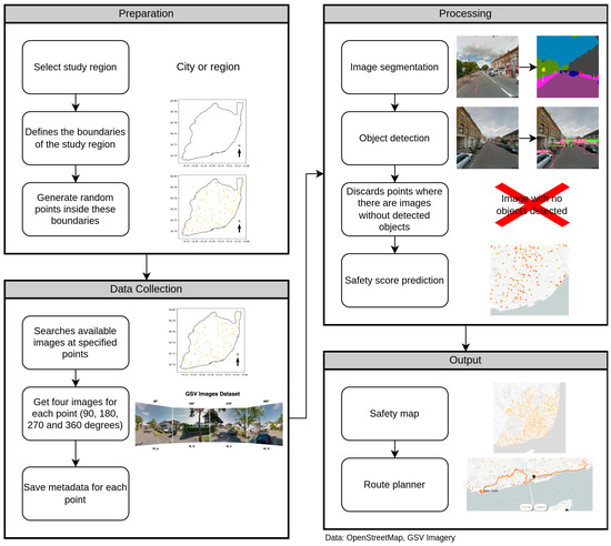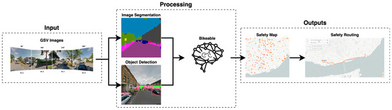Summary of the implemented framework. Input: GSV images; processing: image segmentation and object detection from GSV images, assessed using the Bikeable neural network; and outputs: a safety map created from the safety score provided by Bikeable, and safety routes avoiding dangerous points.