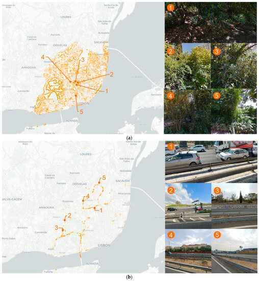 Pixel-level segmentation concentration of detected positive and negative risk factors in Lisbon: selected examples of (a) vegetation; (b) guardrail.