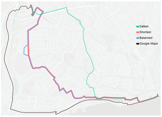 After generating the safety points in a given city, routing is provided by OpenRouteService, an open-source routing platform developed by the Heidelberg Institute for Geoinformation Technology (HeiGIT) [67], using data from OpenStreetMap (OSM).