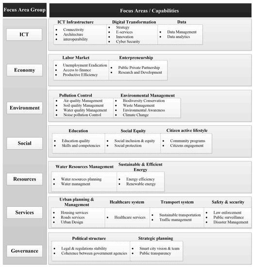 Once the model design is ready, the next phase is to populate. According to [25], the model’s components should be defined along with what will be measured and how. The steps from the focus area development framework were followed to identify the components. First, the focus area groups and the focus areas were defined. Each group was divided into several focus areas, defined as groups of related activities, events, deliverables, or products that support the domain [34]. Grouping the focus areas into labeled categories can increase model accessibility [31]. The seven categories that were identified in the literature review were considered the focus area groups. These groups were divided into eighteen focus areas: ICT infrastructure, digital transformation, data, labor market, entrepreneurship, pollution, environmental management, education, social equity, citizen active lifestyle, water resources management, sustainable and efficient energy, urban planning and management, healthcare system, transport system, safety and security, political structure, and strategic planning. All focus areas were clearly defined to eliminate confusion in scope and precisely identify each area’s capabilities.