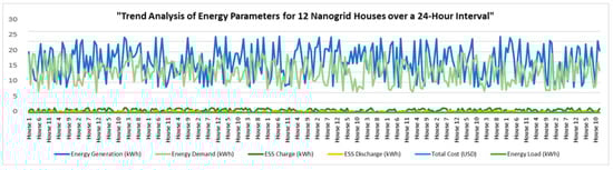 | House. | Hour | Energy Generation (kWh) | Energy Demand (kWh) | Energy Load (kWh) | ESS Charge (kWh) | ESS Discharge (kWh) | Total Cost (USD) |