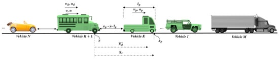 Figure 1 shows the schematic of the new CACF model. This diagram presents the current AV implemented with the CACF model, denoted as Vehicle N (yellow in Figure 1), which is the last vehicle in the network. Since the radar equipped in the vehicles is not able to collect the vehicle’s information outside of 50 m [,], only the previous vehicle within range will be considered as a reference vehicle (green color as Vehicle 1 through K + 1 in Figure 1) in this study, which does not account for occlusion cases within the desired radius. Notably, this study establishes the autonomous vehicle penetration rate but refrains from specifying the specific timing for determining vehicle types, positions, and quantities before the AV employing the CACF model. Consequently, these attributes preceding the ego vehicles are treated as random variables. The CACF model will pre-analyze with the reference vehicles’ information, as described in the following Equations (6)–(12).