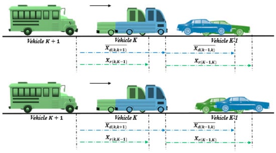 in which, , are the measured coordinates of Vehicle K + 1 and Vehicle K and is the measured length of Vehicle K. In addition, in (6), and , are the predicted clearances based on desired and actual measured data for Vehicle K and is related to the relationship of and as shown in Figure 2. If , Vehicle K drives quicker than it is expected, Vehicle K + 1 needs to accelerate, and then is set as 0. When , two conditions may exist. In the first condition, Vehicle K drives slower than it is expected, and Vehicle K + 1 will need to maintain the same acceleration as Vehicle K, then is also set as 0. In the second condition, Vehicle K deaccelerated because of a traffic event ahead of it, and Vehicle K + 1 needs to deaccelerate accordingly to stay safe, then is set as 1. In order to distinguish which condition Vehicle K is facing, this study sets equals 1 when is larger than the safe distance, , in the case of , otherwise, equals 0, in which, can be calculated as below: