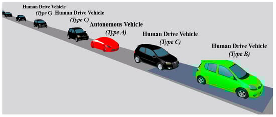 In this case study, to simplify the simulation, the analysis was performed on a single-lane freeway road segment of 5 km. To simulate the mixed-driver environment, the human driver and AVs were considered to co-exist. The W99 model was used for the human driver, whereas three different external car-following models were applied to the AVs including the ACC model, the CACC model, and the new CACF model. Thus, on the simulated road segment, there are three types of cars accordingly as shown in Figure 3. All of the AVs were set as Type A, for the human drivers, two types of vehicles were considered based on their characteristics including Type B which would stop in front of a stop sign to induce a conflict to occur, whereas Type C would not stop in front of a stop sign. Since the analysis is targeted at mixed traffic environments with human drivers dominating the traffic, the penetration rate of AVs was assumed to be 10% of the traffic flow, which is a very low penetration rate. Thus, for every 100 vehicles, there will be 10 AVs (Type A), one Type B human driver, and 89 Type C human drivers. The occurrence order of the types of vehicles is random. For Type A vehicles (AVs), the and values in (2) for the ACC and CACC models, and in (9) for the CACF model, were set to be 0.58 and 0.1 in the DriverModel.cpp file of the DLL, respectively, as recommended by Zhao and Sun [].
