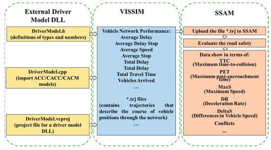 The workflow diagram of the external driver models DLL, VISSIM, and SSAM.